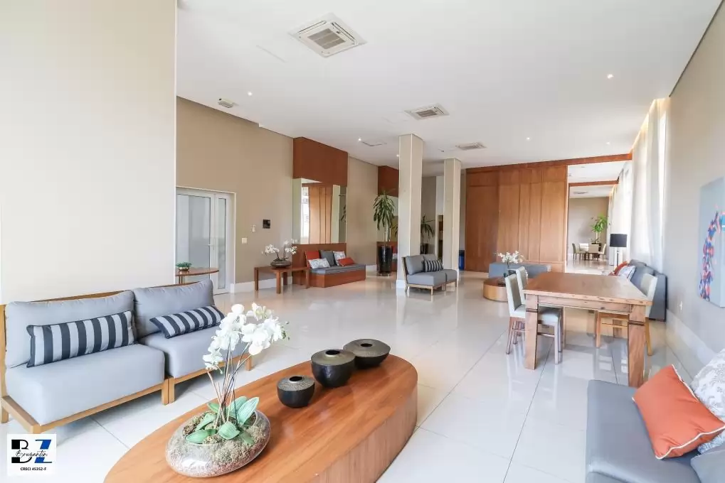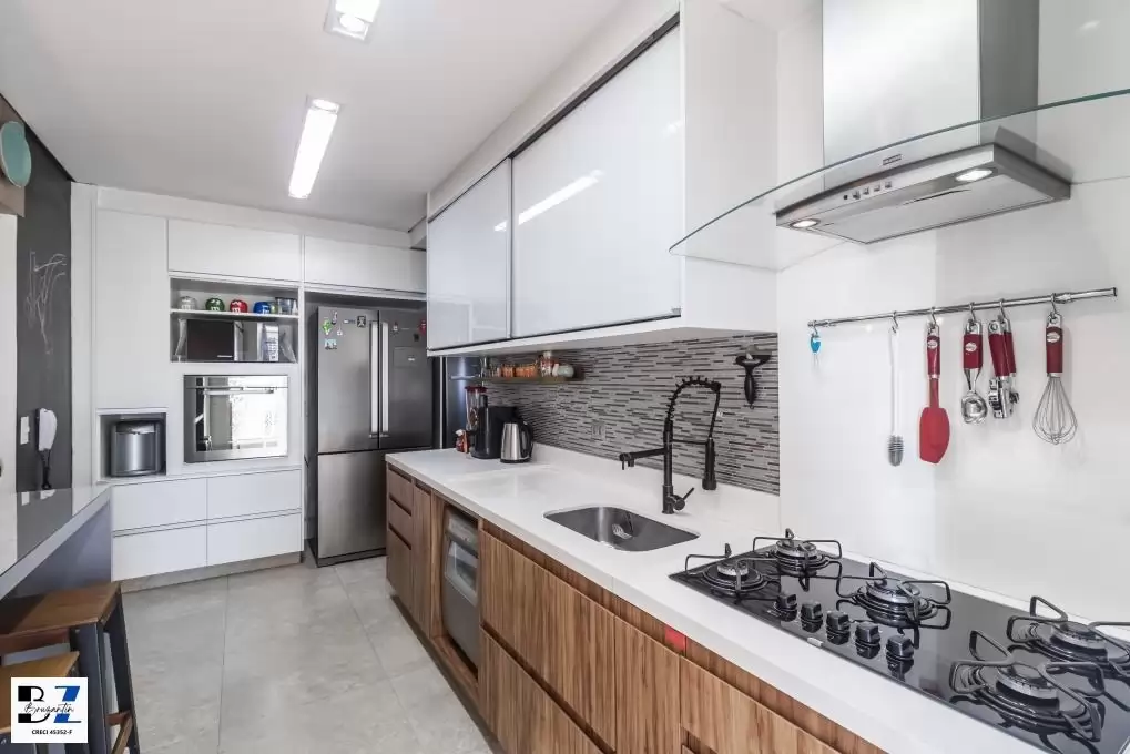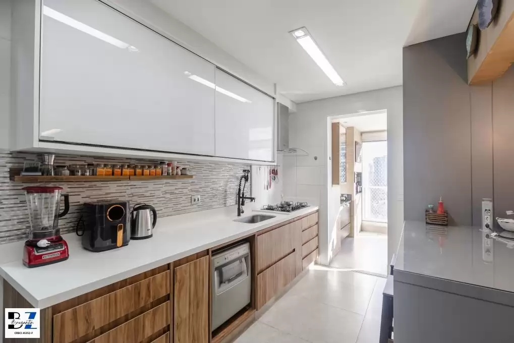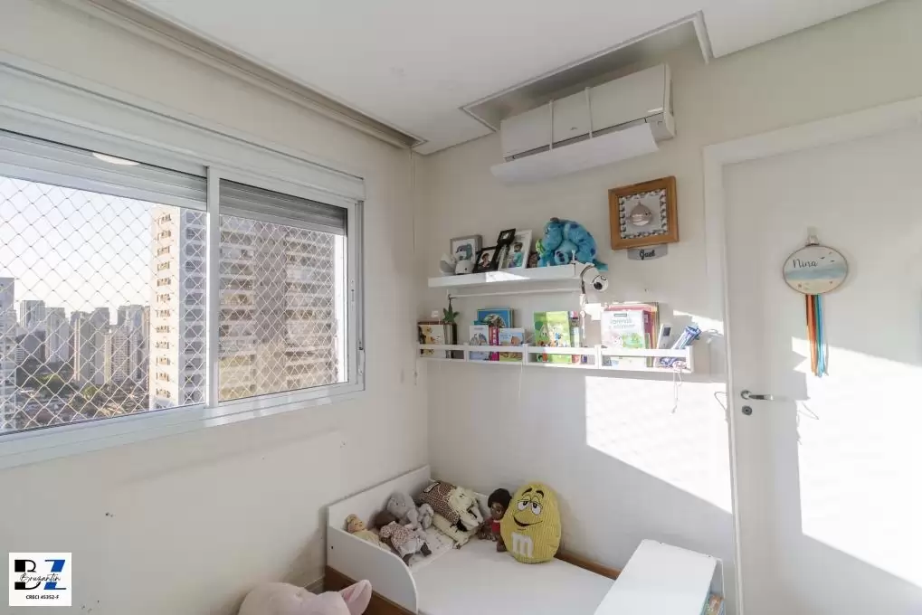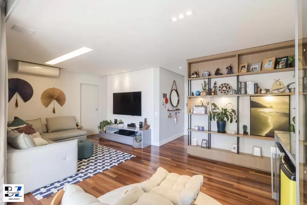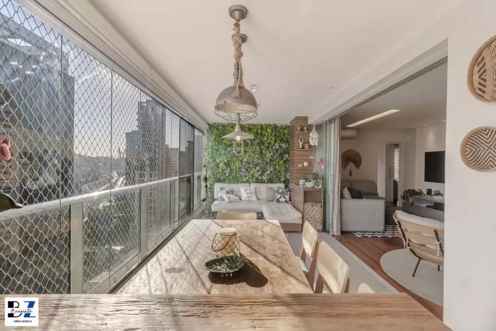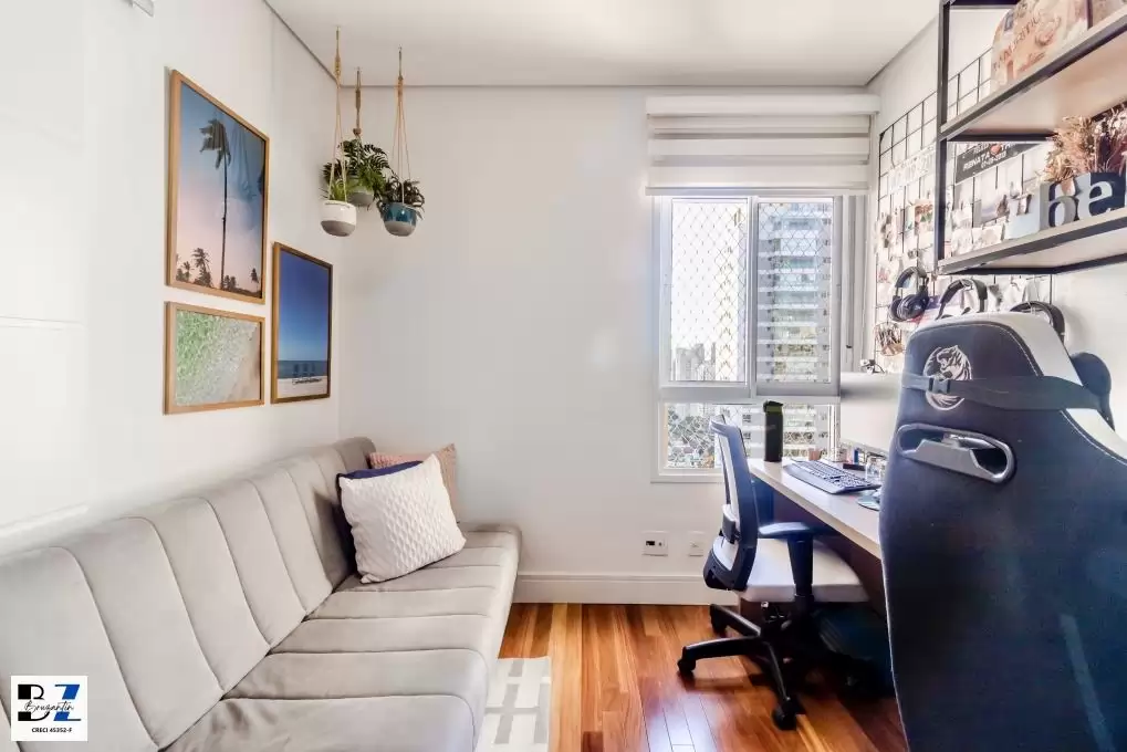 Possui móveis planejados de alta qualidade, ar condicionado em todos os ambientes, sala integrada com varanda gourmet e churrasqueira também integrada a cozinha, lavabo, cozinha repleta de armários, área de serviço completa com despensa, são 2 vagas de garagem + depósito privativo.