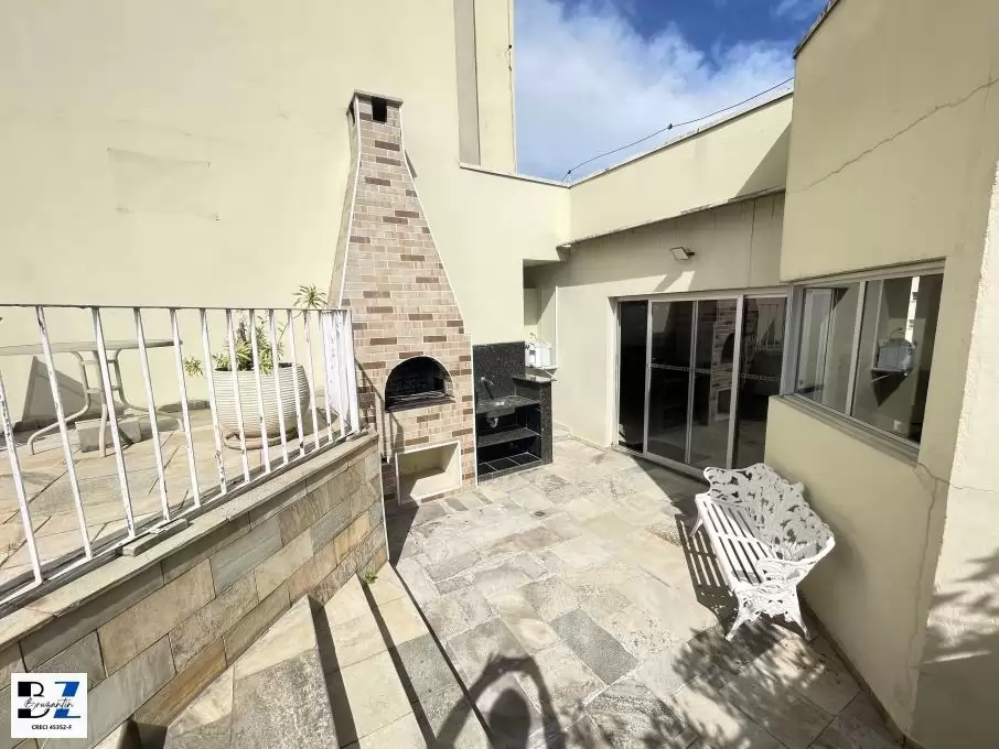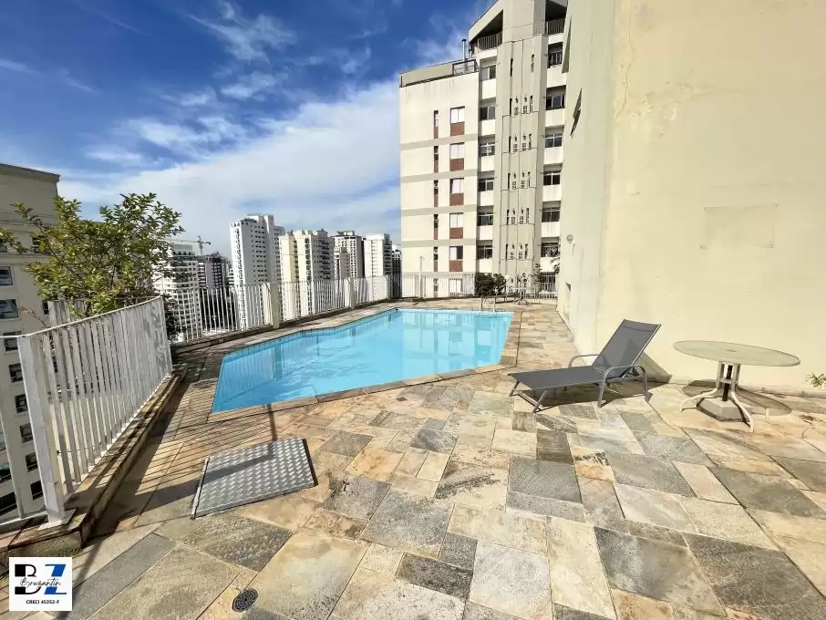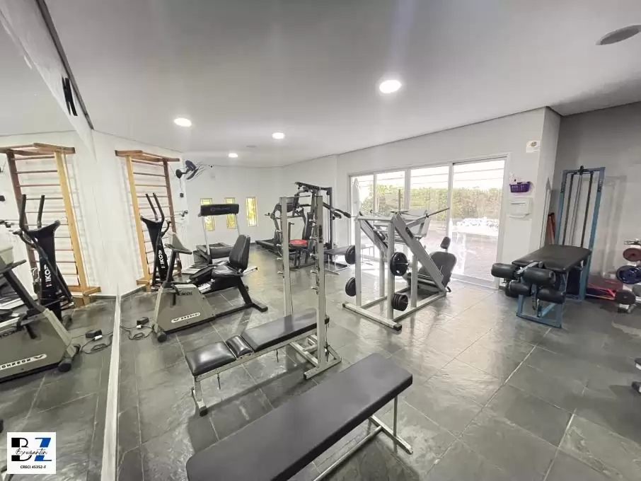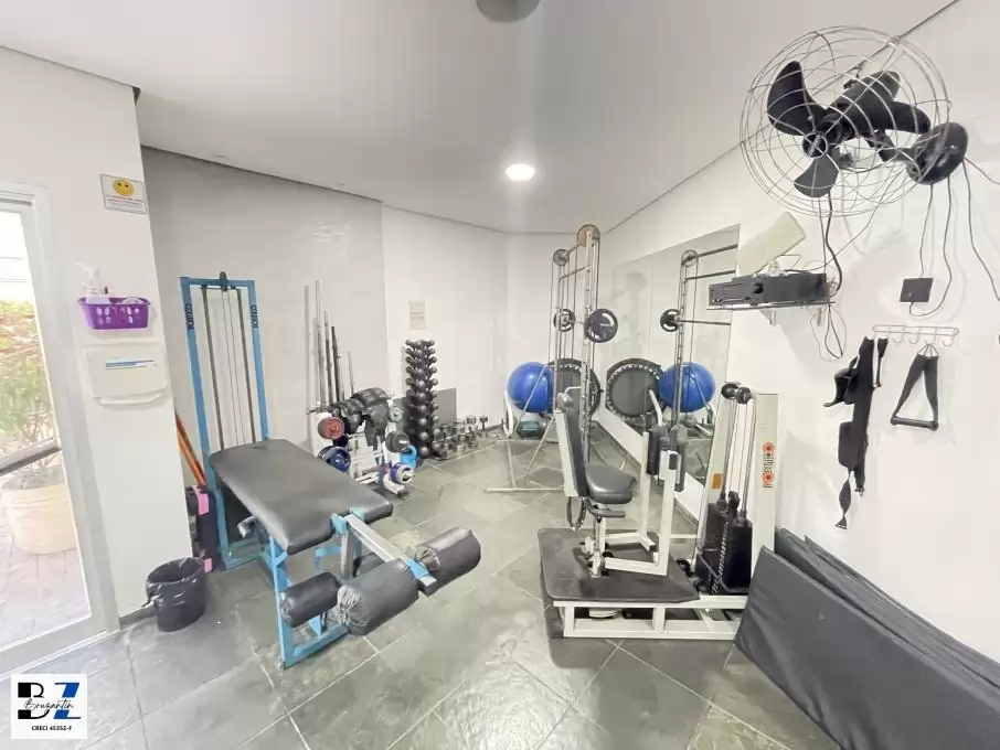 Prédio com piscina, sauna, sala de ginástica, churrasqueira, salão festas e lavanderia coletiva.